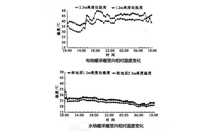 从图我们可以看出,发热电缆供暖时,相对湿度平均为41.5%,水地暖采暖时,相对湿度仅为24.5%。